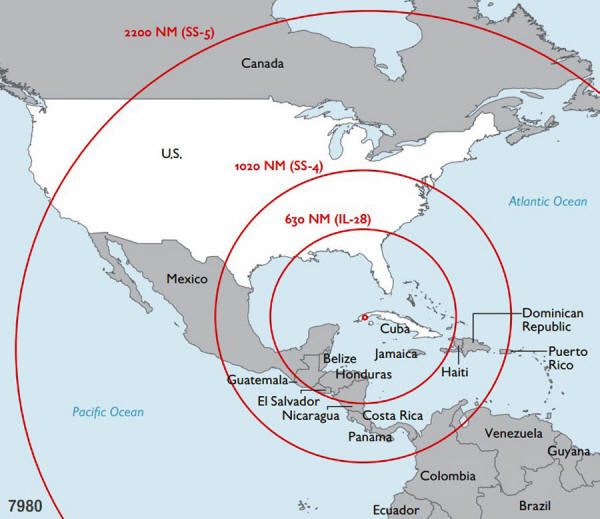 Alcances de las armas soviéticas desplegadas en Cuba: los bombarderos Il-28 podían alcanzar 1.166 km, pero los misiles R-12 hasta 1.880 km y los R-14 aún más, del orden de los 4.070 km. Esta circunstancia aterró a las autoridades estadounidenses.