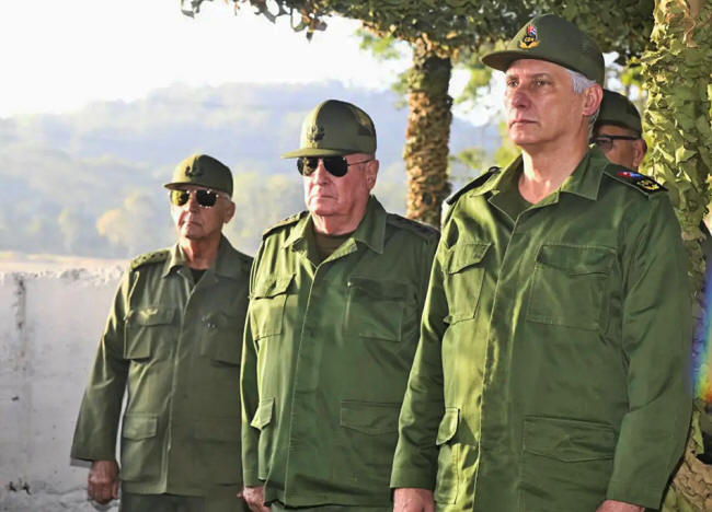 El presidente cubano Miguel Díaz-Canel en fajina militar, con otros mandos, ha dispuesto la movilización ante el peligro de guerra.