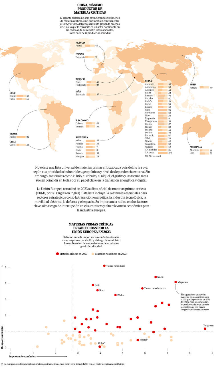 Eso sigue igual, pues Pekín continúa siendo el mayor proveedor global de la mayoría de las materias primas críticas, con cuotas cercanas al 100% en tierras raras, magnesio o galio.
