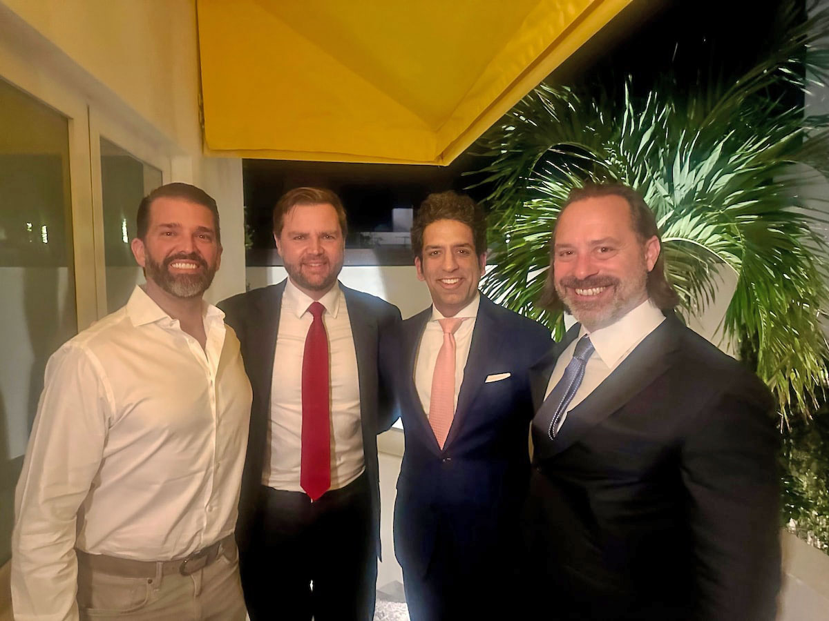 From left, Donald Trump Jr., JD Vance, Omeed Malik and Chris Buskirk convene in Palm Beach days before Trump's second inauguration. © Obtained by The Post/ Obtained by The Post
