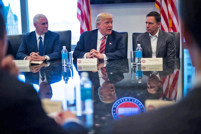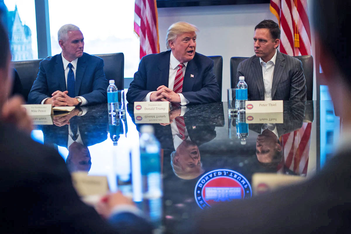 Vice President-elect Mike Pence, left, and PayPal founder Peter Thiel listen to President-elect Donald Trump during a meeting with technology industry leaders at Trump Tower in New York in 2016. © Jabin Botsford/ The Washington Post