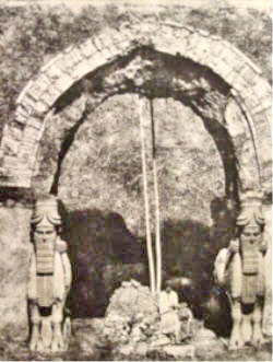 Such gateways (stargates) were represented on earth in Assyrian archways built through elaborate construction ceremonies and blessed by names of good omens. Colossal transgenic creatures stood guard at the gates and palace entries to keep undesirable forces from coming through the portals--important imitative magic thought to represent heavenly ideas--guardians that were often accompanied by winged spirits holding magic devices and magic statuettes concealed beneath the floors.