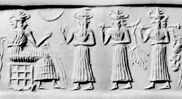 Ea (seduto) e le divinità che lo accompagnano. Sigillo cilindrico sumero, aprox. 2300 a.C. Immagine dalla Biblioteca Pierpont Morgan, Nueva York