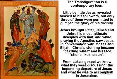 «Dopo sei giorni, Gesù prese con sé Pietro, Giacomo e Giovanni e li portò sopra un monte alto, in un luogo appartato, loro soli. Si trasfigurò davanti a loro e le sue vesti divennero splendenti, bianchissime: nessun lavandaio sulla terra potrebbe renderle così bianche. E apparve loro Elia con Mosè e discorrevano con Gesù. Prendendo allora la parola, Pietro disse a Gesù: