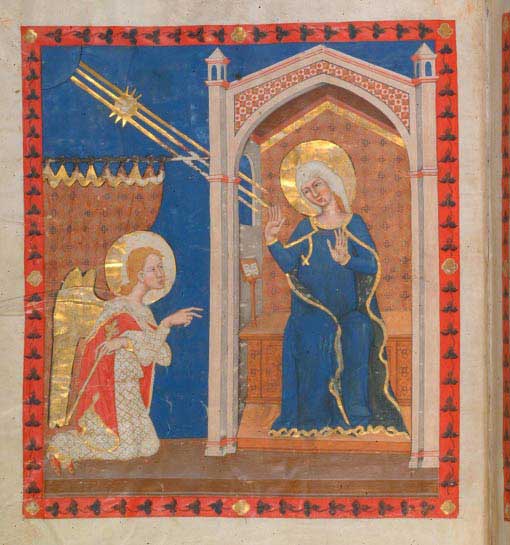 We can therefore safely identify in the Madonna and Child with the Infant St. John exposed in Palazzo Vecchio the same announcement scene which is described by the Gospel of Luke. But one might wonder, since there is no talk of "luminous clouds" in Luke, whence could this particular have come from?