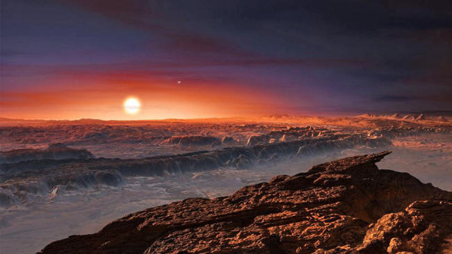 An artist's depiction of the view from the surface of Proxima b, with the two stars of Alpha Centauri visible low in the skies. (Image credit: ESO/M. Kornmesser)