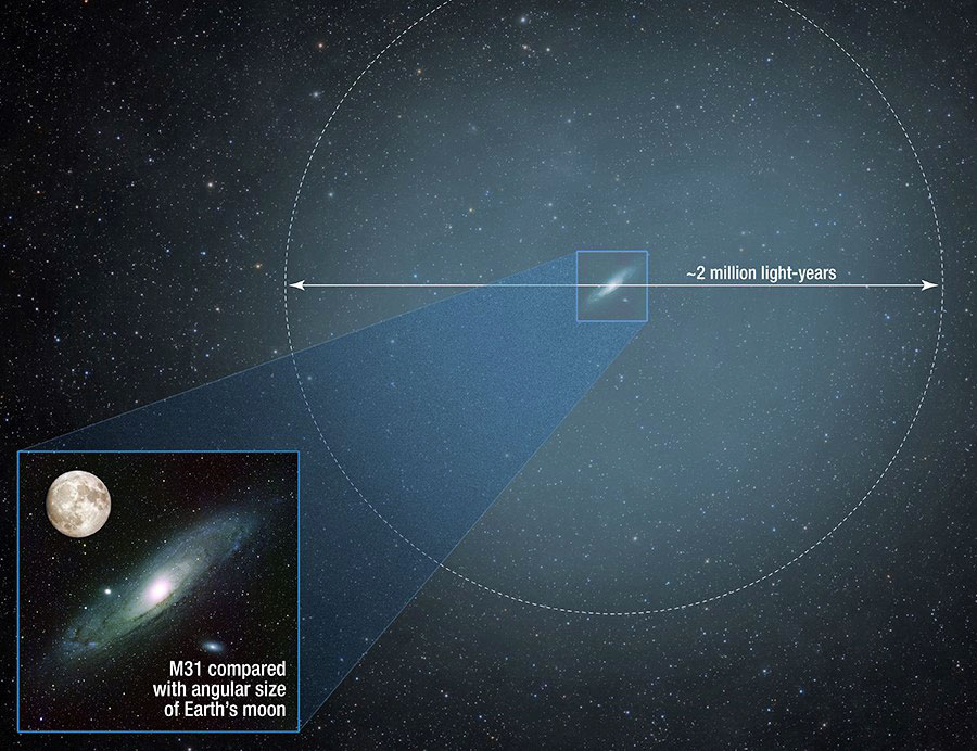 El halo de Andrómeda es gigantesco. Extendiéndose al menos 2 millones de años luz, si pudiéramos ver en nuestro cielo nocturno sería 100 veces el diámetro de la Luna o 50 grados a través! Crédito: NASA