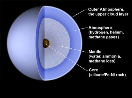 Within the troposphere are layers of clouds - water clouds at the lowest pressures, with ammonium hydrosulfide clouds above them. Ammonia and hydrogen sulfide clouds come next. Finally, thin methane clouds lay on the top.