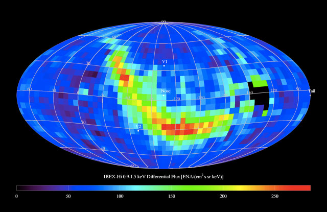 IBEX's all-sky map of energetic neutral atom emission reveals a bright filament of unknown origin. V1 and V2 indicate the positions of the Voyager spacecraft. [more]