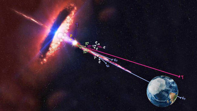 The supermassive black hole at the center of the accretion disk sends a narrow high-energy jet of matter into space, perpendicular to the disc. A blazar about 4 billion light years away is the origin of many of the highest-energy cosmic rays and neutrinos.
