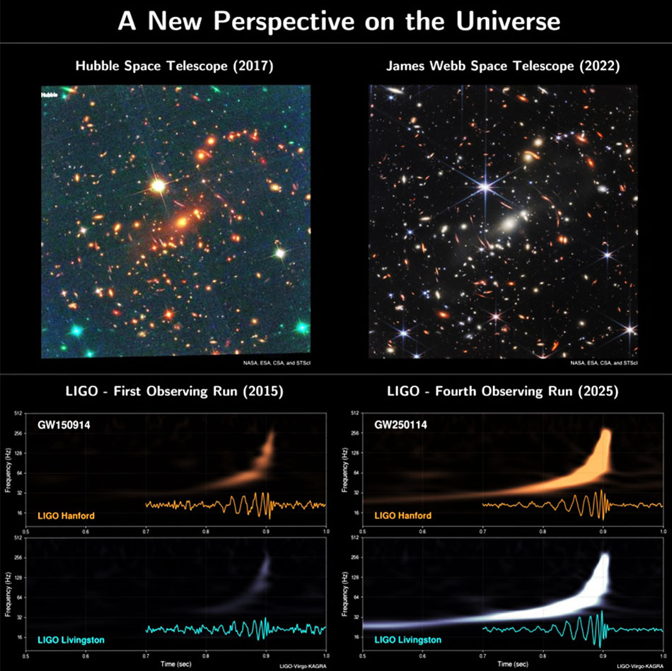 Infographic showcasing the advancements of gravitational wave observatories - among the most precise measuring machines ever built by humankind, in observing black hole cosmic collisions, with the registered signals shown in the bottom panel. (Image credit: Dr. Derek Davis (Caltech, LIGO Laboratory).)