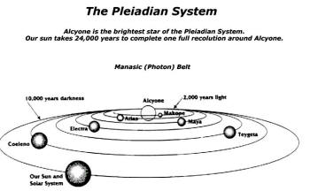 illuminates us is the seventh sun that circles Alcyone" and "Alcyone