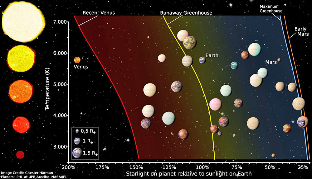 Figure showing the habitable zone for different types of stars, as well as the location of terrestrial size Kepler candidates. Credit: Chester Harman