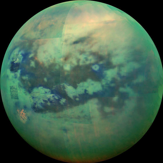 as seen by NASA's Cassini spacecraft. Because Titan's atmosphere is so hazy, viewing it in the wavelengths of visible light is not possible. Using the infrared spectrum enables us