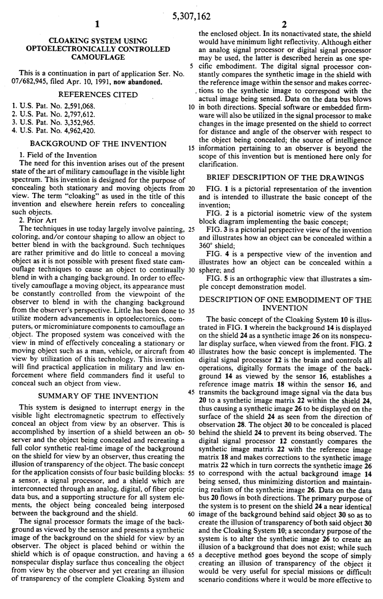 This inventor has worked for the military and defense contractors and may have had access to alien invisibility technology that had been back-engineered and given to him to be patented, as if it was a result of research on the job. These advanced high tech items never seem to come from basement inventors.